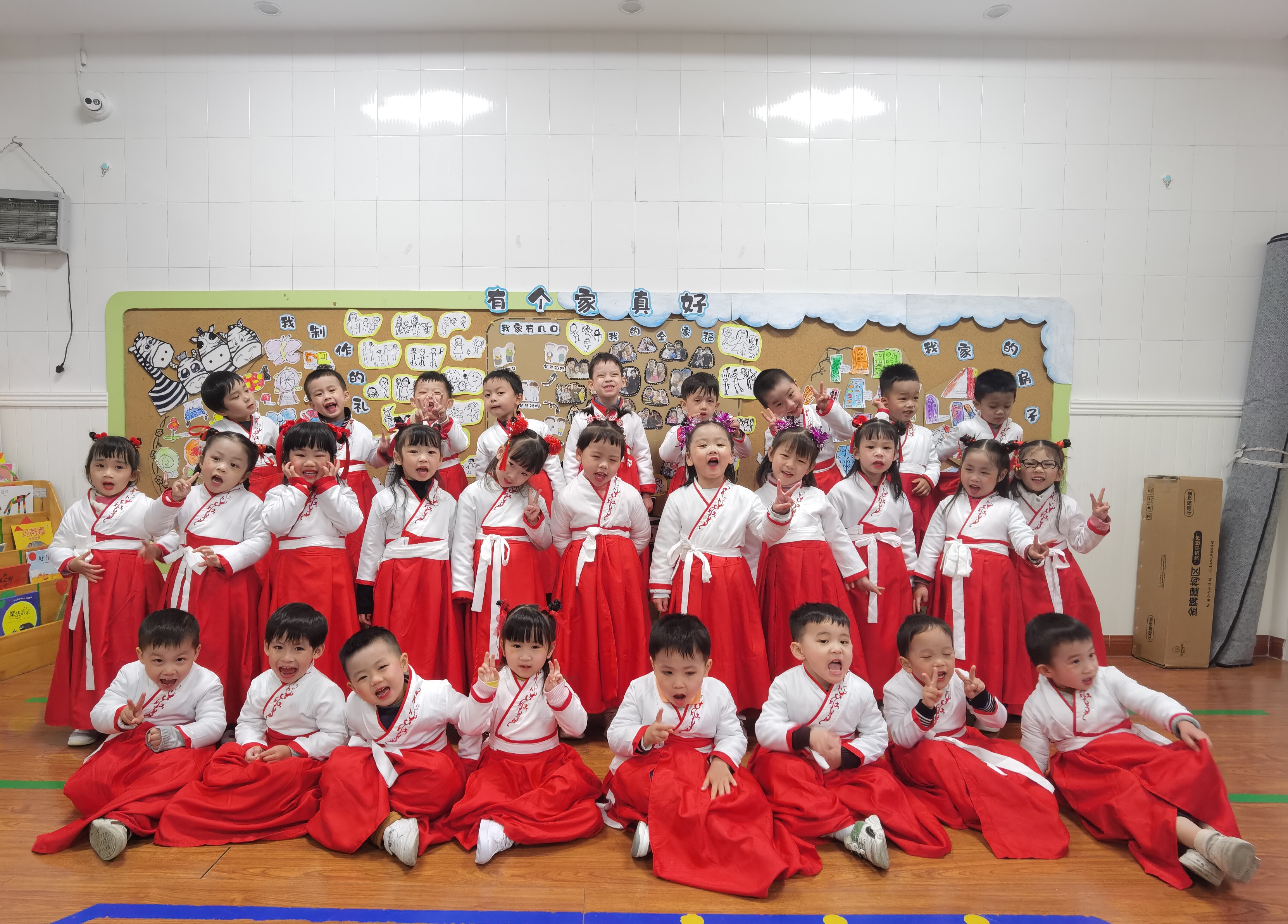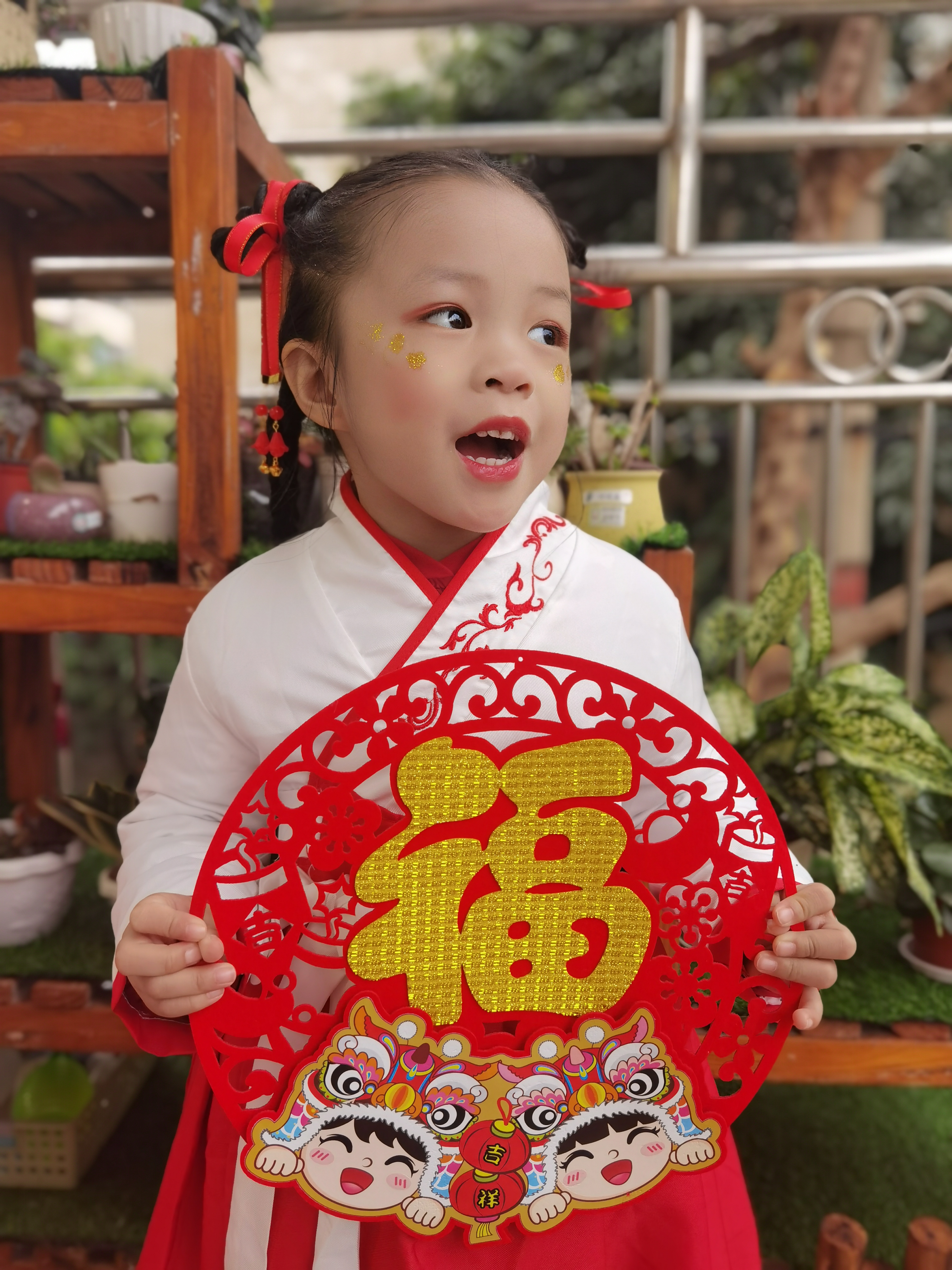教室里满是绚丽的汉服衣角翻飞,同学们穿着精美的襦裙、长衫,在走廊里嬉笑打闹。辉辉老师身着一袭墨色汉服,手持相机,为我们记录下一张张灿烂的笑脸。大家挤在一起合影时,有同学的发簪不小心勾住了同伴的飘带,引得满堂欢笑。随后,我们踩着椅子、踮着脚尖,将红彤彤的福字贴在教室门窗上,有的福字贴歪了,倒像是在俏皮地向我们招手。