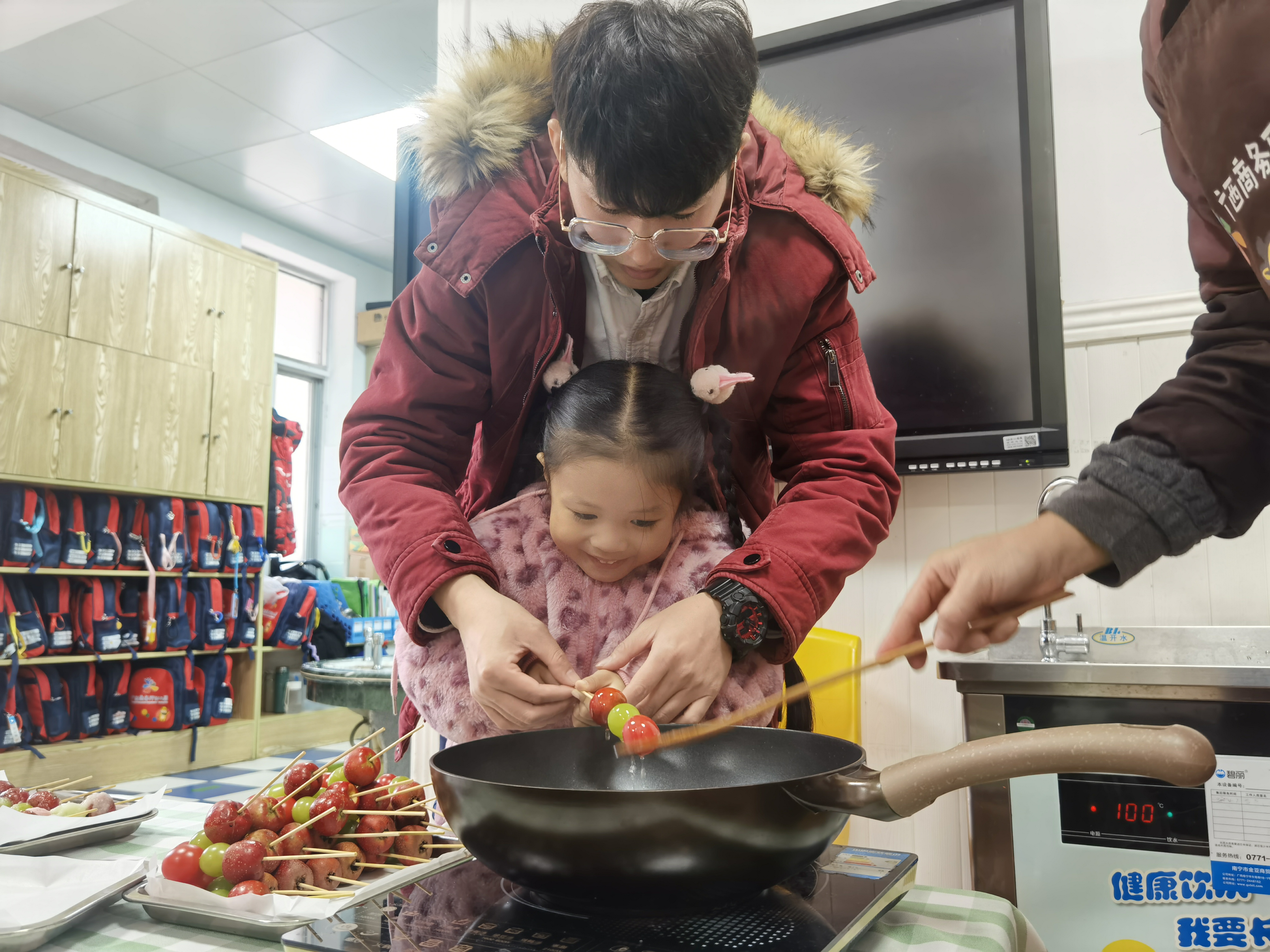 热闹过后,寒气顺着门缝溜进屋里,辉辉老师换上蓬松的暗红色羽绒服,在暖黄的灯光下像团跳跃的火焰,袖口还沾着几粒糖霜。他轻轻扶住我的双手,带着我将洗净的圆润果子串在竹签上,颗颗透着诱人的光泽,与暗红色的衣摆相映成趣。一旁的锅里,糖浆正咕嘟咕嘟地冒着泡,浓稠的糖液翻涌着,腾起的热气将羽绒服的毛领都蒙上了一层白雾。当他扶着我的手,将串好的果子快速浸入糖浆,再拉出晶莹透亮的糖丝,果香与甜香在空气中弥漫开来,我们举着糖葫芦碰 “签”,笑声驱散了冬日的寒意。